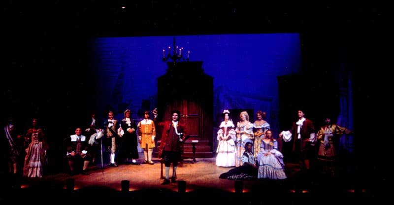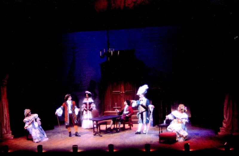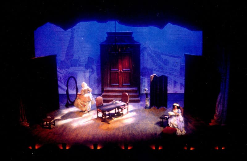 Ken Canfield’s set design included a raked stage for this production. Together, we also included footlights.